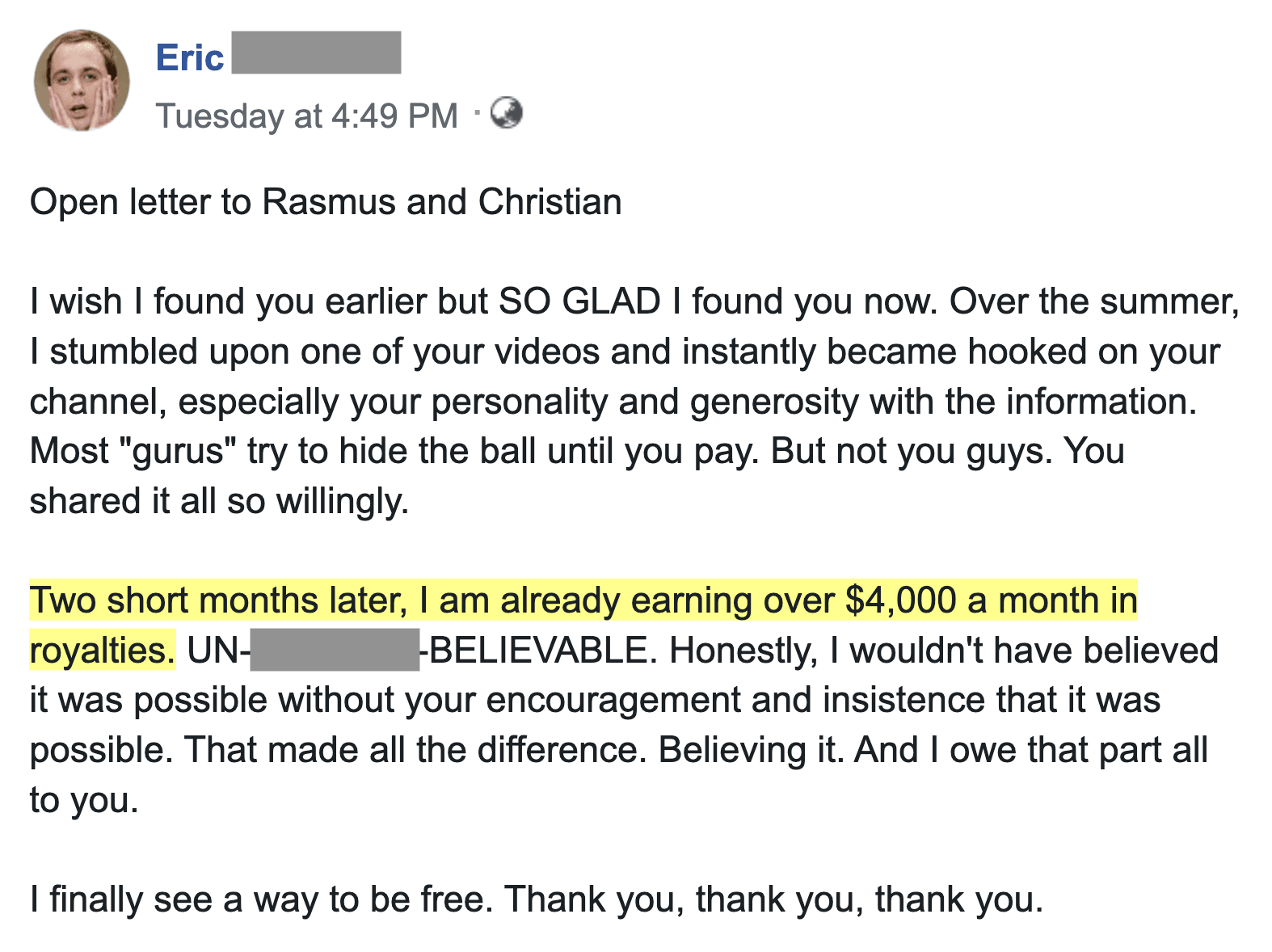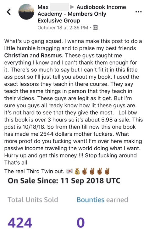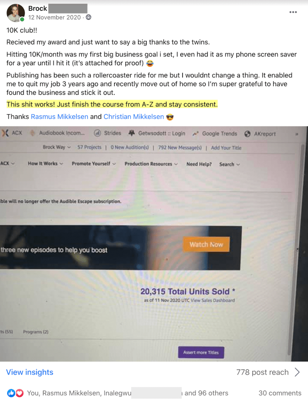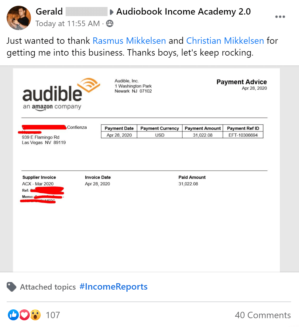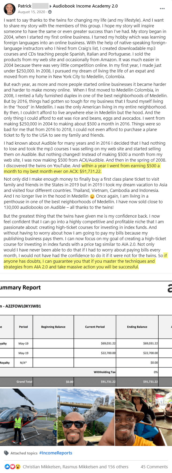 Rasmus & Christian Mikkelsen are the founders of Publishing.com, an online education company that helps ordinary people escape their 9 to 5 job life using the Amazon book publishing business model. Audiobook Income Academy 2.0 is the flagship program the Mikkelsen Twins created to fulfill their company's mission. You will be learning directly from the Twins, the fathers of audiobook publishing, who have created dozens of (verified) 5 and 6-figure audiobook publishers. These are people who had no skills and no experience within publishing before joining the AIA program who have now been able to quit their jobs and make more money than they ever did before at their job.